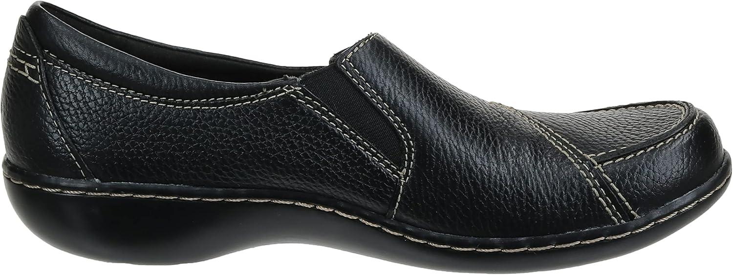 The ultimate in ease and wear ability, this classic slip-on shoe from the clarks collection is crafted of supple leather on a popular low bottom. incredibly comfortable, it features a stretch gore, fabric linings, and super flexible, lightweight tpr outsoles. this go-to women's shoe is an excellent choice for career or casual wear.